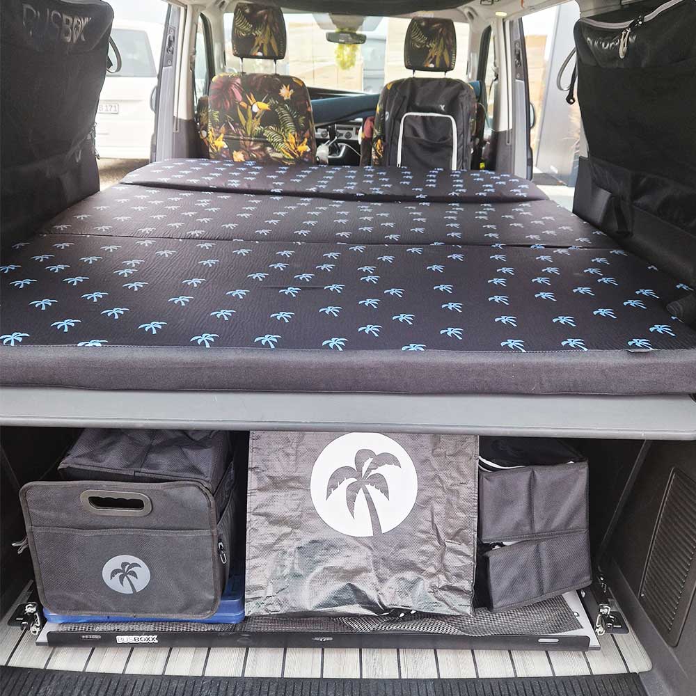 Die hochwertige Klappmatratze passt perfekt in deinen VW T5/T6/T6.1 Bus und bietet maximalen Komfort auf Reisen. Dank Falttechnik schnell einsatzbereit und leicht verstaubar. Die Palmen-Optik macht Lust auf Urlaub und ist ein echter Hingucker.